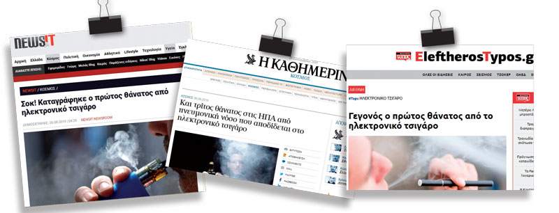 Το ζήτημα έλαβε διαστάσεις και στην Ελλάδα, με τον Σύνδεσμο Ελληνικών Επιχειρήσεων Προϊόντων Ατμίσματος να «απαντά», επισημαίνοντας ρεπορτάζ του επιστημονικού περιοδικού MedicalDaily, το οποίο κι αναφέρει ότι τα κρούσματα οξείας αναπνευστικής ανεπάρκειας συνδέονται με χρήση παράνομων υγρών αναπλήρωσης, στα οποία είχε προστεθεί έλαιο ινδικής κάνναβης με την ψυχοτρόπο ουσία THC, τα οποία πωλούνται στη μαύρη αγορά. Στο ρεπορτάζ σημειώνεται ότι εταιρείες όπως η Dank Vapes είναι συνήθως εμπορικά σήματα, χωρίς εταιρική ταυτότητα, τα οποία τροφοδοτούν το παραεμπόριο με αυτοσχέδια σκευάσματα που παράγονται από ιδιώτες σε οικιακούς χώρους. άτμισμα ηλεκτρονικό τσιγάρο