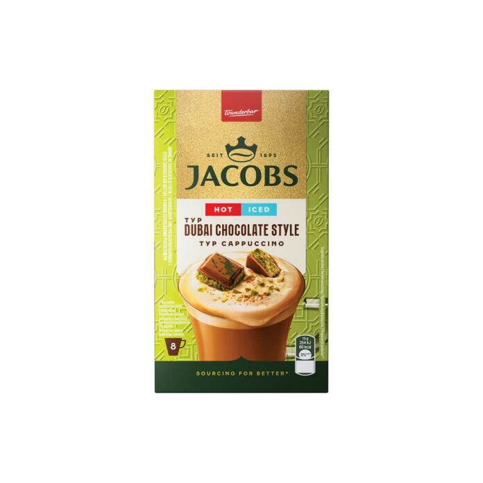 Η επιλογή του συνδυασμού σοκολάτας-φιστικιού δεν είναι τυχαία. Η τάση Dubai Chocolate έχει κατακτήσει τα τελευταία χρόνια τις διεθνείς αγορές, καθώς συνδέεται με πιο premium γευστικές εμπειρίες και εμπνέεται από τη Μέση Ανατολή, όπου η σοκολάτα συναντά ιδιαίτερους ξηρούς καρπούς. Με το νέο cappuccino, η Jacobs φέρνει αυτή την τάση πιο κοντά στον καταναλωτή της καθημερινότητας. Το προϊόν διατίθεται σε συσκευασία με 8 sticks των 15g.