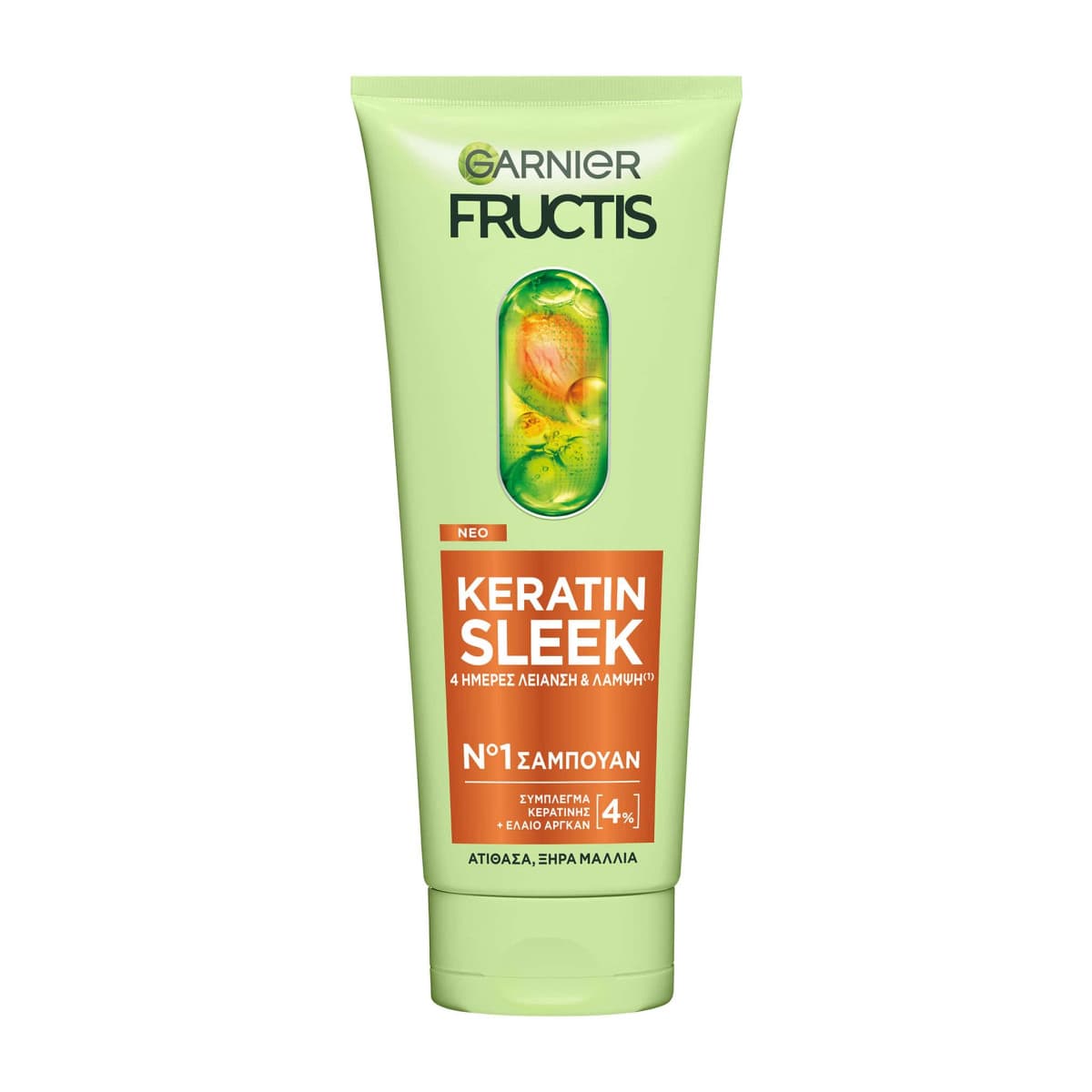 Η νέα σειρά Fructis Keratin Sleek της Garnier απευθύνεται σε καταναλωτές που αναζητούν ολοκληρωμένες λύσεις περιποίησης για τα μαλλιά. Ο συνδυασμός κερατίνης και ελαίου argan στο σύμπλεγμα λείανσης 4% συμβάλλει στην ενδυνάμωση της τρίχας, ενώ ταυτόχρονα βελτιώνει την υφή της, μειώνοντας το φριζάρισμα. Σύμφωνα με την εταιρεία, η σειρά περιλαμβάνει: